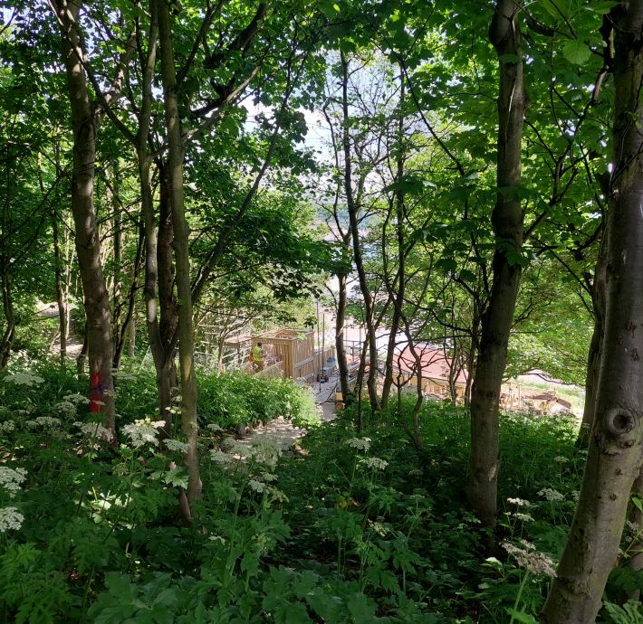 The play area at South Cliff Gardens is a real triumph of creativity and logistics navigating a steep wooded slope and capitalising on the dramatic views along the Scarborough coastline. The brief from the outset was to have a mix of play for all ages and abilities that maximised use of the sloping landscape. The themes were to draw strongly on the heritage of the site with inspiration from: the delicate Victorian architecture of the Shelters; Joseph Paxton’s design for the former viewing tower at the Spa; Italianate design and the concept of the Tuscan alpine village and the beautiful coastal setting of Scarborough’s South Bay. Studio Hardie developed designs for a tiered play experience that stepped down the slope. At the top a dramatic Tower with internal maze that aesthetically responded to Paxton’s former viewing Tower with slide exit (certainly a missed opportunity for Paxton!). This led across the Most Accessible Route to a secondary tower and bridge unit ‘The Victorian Tower’ heavily inspired by the architectural themes evident in the 13 shelters of the Gardens with a second slide exit. Adjacent to this across the connecting steps is a dramatic adventure trim trail navigating the steep slope and providing more challenging play and at the bottom of the slope a sand pit with timber climbing features and a quiet area with circular story telling bench for younger explorers.