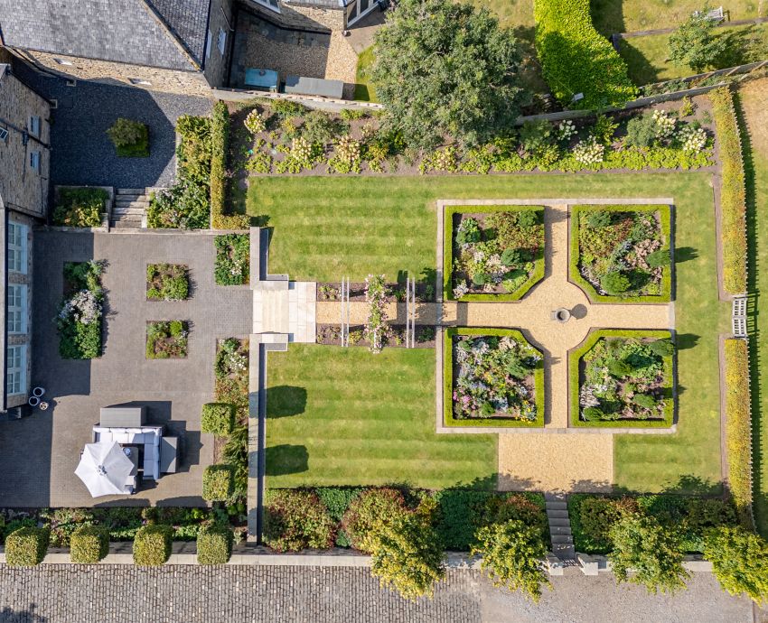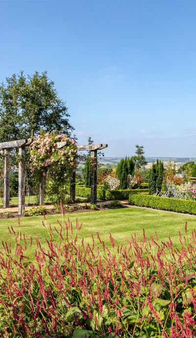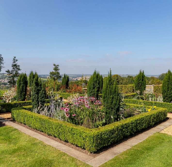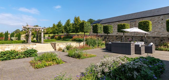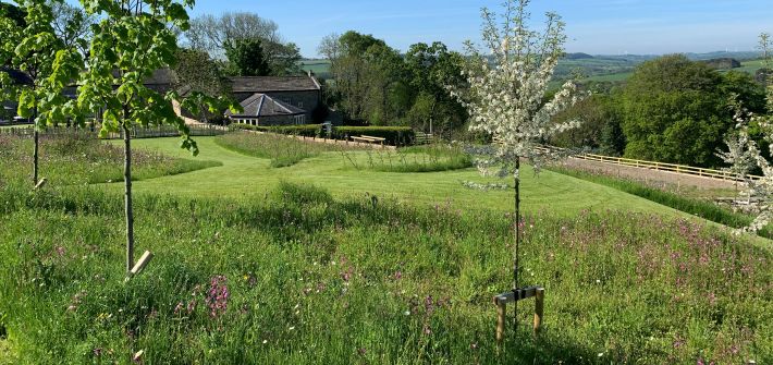 Southern Green Ltd was commissioned to develop proposals from concept to implementation for this 18th century farmhouse garden in County Durham. A series of terraced garden spaces were designed to take advantage of the topography and so that the garden became an extension to the house. Adjacent to the house, a square shaped terrace has been created which acts as an outdoor dining space and includes richly planted beds. Adjacent to the central space is a sunken garden, consisting of timber sleepers and shade loving plants. The terrace is framed by box headed trees backed by a stone retaining wall and is anchored on the axis to the garden rooms beyond. The transition from the terrace is marked by stone steps and a pergola which frames the view of the formal garden. Beyond the formal garden, a wildflower meadow leads to the viewing mound and orchard. The mound provides views back over the contrasting garden spaces and also provides spectacular views across the valley.