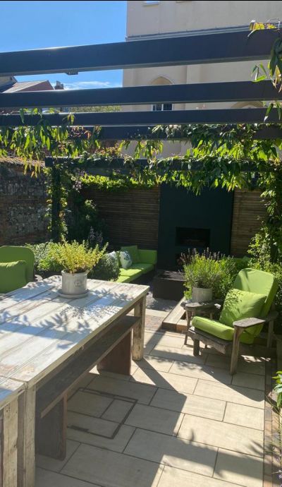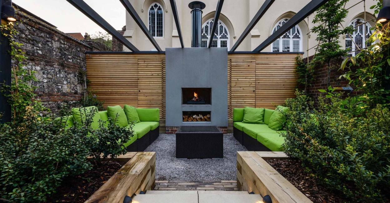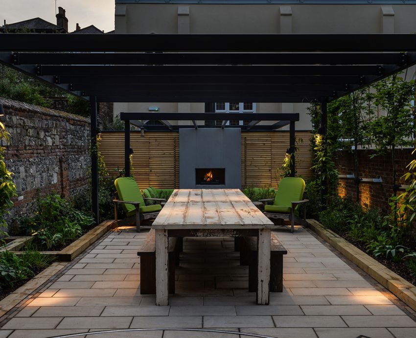 The space at the end was designed to be intimate and provide a relaxed environment, a place to retire when entertaining or in private with an outdoor fire and pergola.