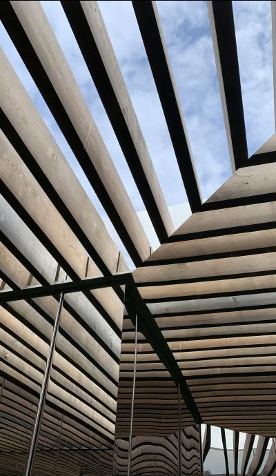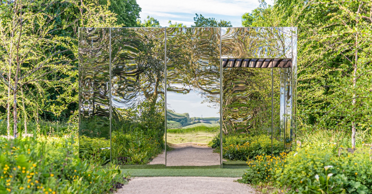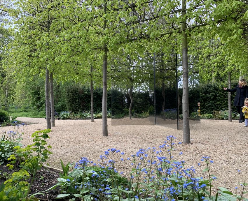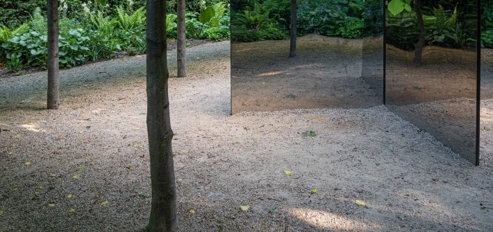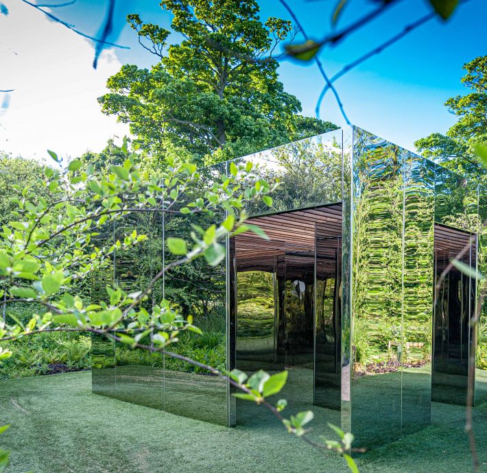Set in a birch grove, the mirror cube reflects its surroundings creating an infinite birch forest and a carpet of dark understory planting. The mirrored form of the installation disappears on approach. Studio Hardie commented ‘Within the cube is an accessible mirror maze, drawing the birch grove in and through its angled mirrors. The maze appears infinite with several surprises, assumed walls don’t exist whilst openings appear closed. The cube’s visible surfaces are entirely clad in highly polished stainless steel mirror, distorting and reflecting the surroundings. The ceiling is slatted aluminium composite allowing rain and light to fall through the structure’.