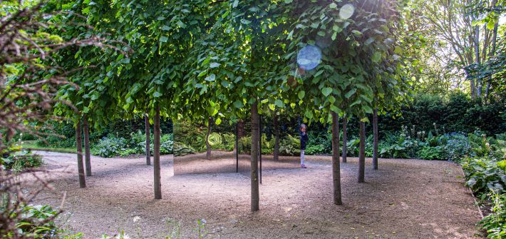 On the same axis of the formal path, nestled in a shaded woodland area, the Dark Matter Cube reflects the mirrored cube. The cubic form is defined by pleached hornbeam trees, replicating the same form as the mirrored cube. Studio Hardie Commented ‘Holding their leaves in winter, the carefully shaped upper cube absorbs light, whilst the mirror reflects. In the centre of the cube is a star shaped mirror that is positioned and angled so that it creates an infinite forest of tree trunks under the pleached top. Whilst the mirror cube reflects its surroundings, the dark matter cube reflects itself, creating an infinite forest within. The mirror is free standing and constructed from highly polished stainless steel mirror’. Shade tolerant planting surrounds the installation which is reflected by the star shaped mirror creating a warped experience.