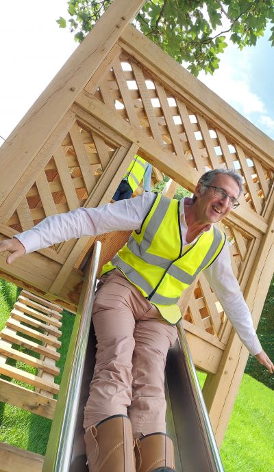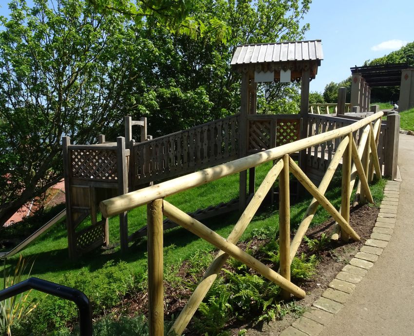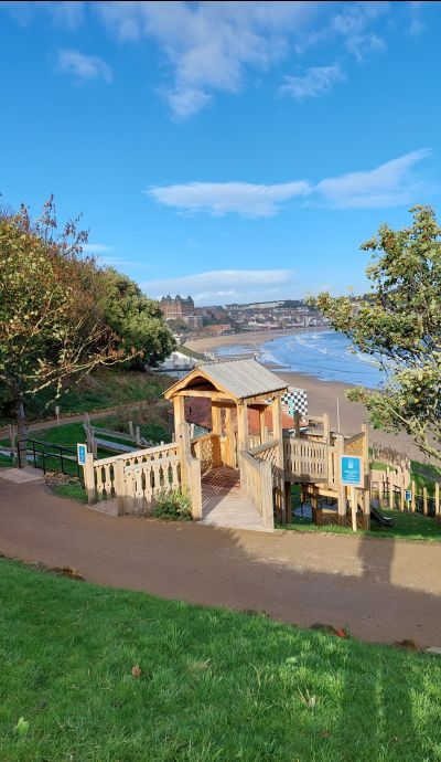 The play area at South Cliff Gardens enables users to navigate steep, wooded slopes, and capitalises on the breathtaking views that span the Scarborough coastline. From the project's inception, the brief was to create a diverse play space that caters for all ages and abilities, whilst maximising the unique contours of the sloping landscape. The resulting play area emerges as a jewel within the Gardens, harmoniously responding to the aesthetic nuances of architectural features and surrounding landscape character.
