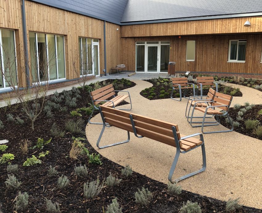 The new building includes 29 individual courtyard spaces for patient and staff use, as well as a focal entrance space, a communal garden and functional landscape spaces to the site perimeter. Each space includes design features specifically designed to suit the varying needs of the patients in each ward.